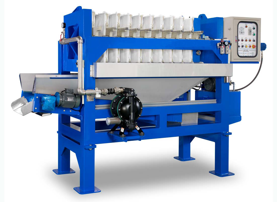 板框式壓濾機是利用高壓氣動隔膜泵浦,將高濃度之物料,打入板框濾室中,利用高壓脫水,產生固化之泥餅及清澈之過濾水。濾板式壓濾機能達到每平方公分6到7公斤的滲透壓,再依其產物與製程的特性,進而可得到50%至75%的溼度。