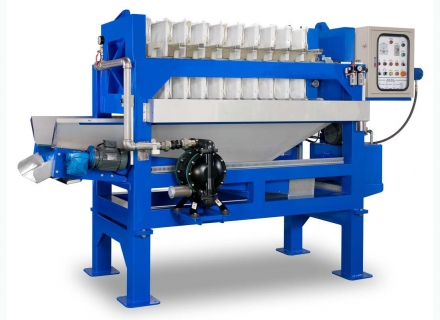 板框式压滤机是利用高压气动隔膜泵浦,将高厚度之物料,打入板框滤室中,利用高压脱水,产生固化之泥饼及清澈之过滤水。滤板式压滤机能达到每平方公分6到7公斤的渗透压,再依其产物与制程的特性,进而可得到50%至75%的湿度。